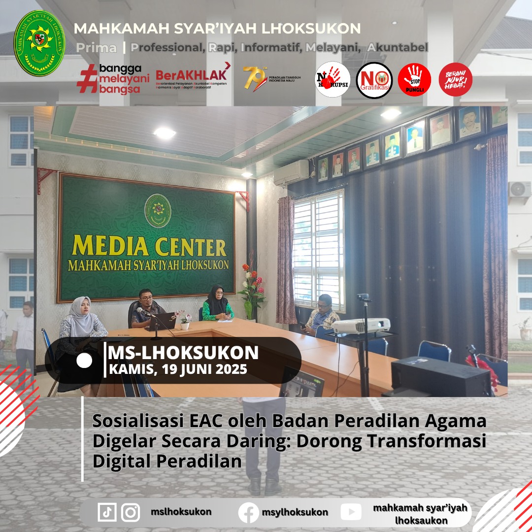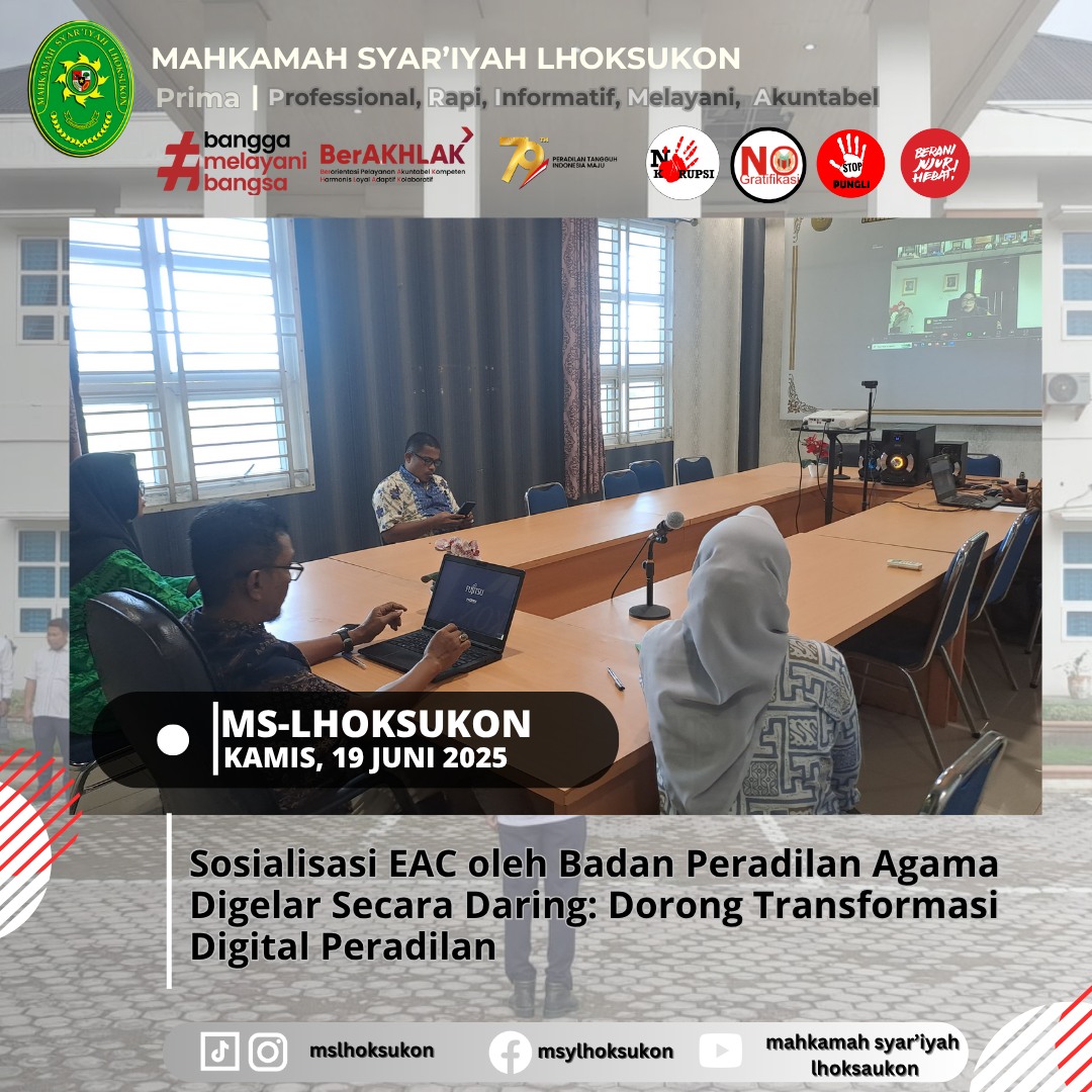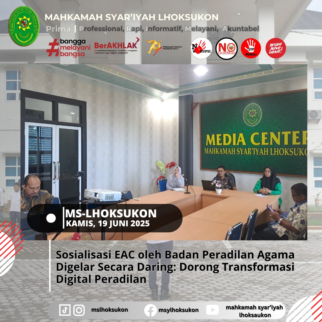 Lhoksukon | Kamis, 19 Juni 2025 – Mahkamah Syar’iyah Lhoksukon mengikuti kegiatan Sosialisasi Electronic Administrative Court (EAC) yang diselenggarakan oleh Direktorat Jenderal Badan Peradilan Agama Mahkamah Agung RI secara daring. Sosialisasi ini merupakan bagian dari langkah strategis Badilag dalam mendorong percepatan transformasi digital peradilan agama di seluruh Indonesia.