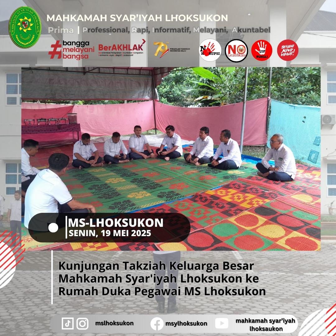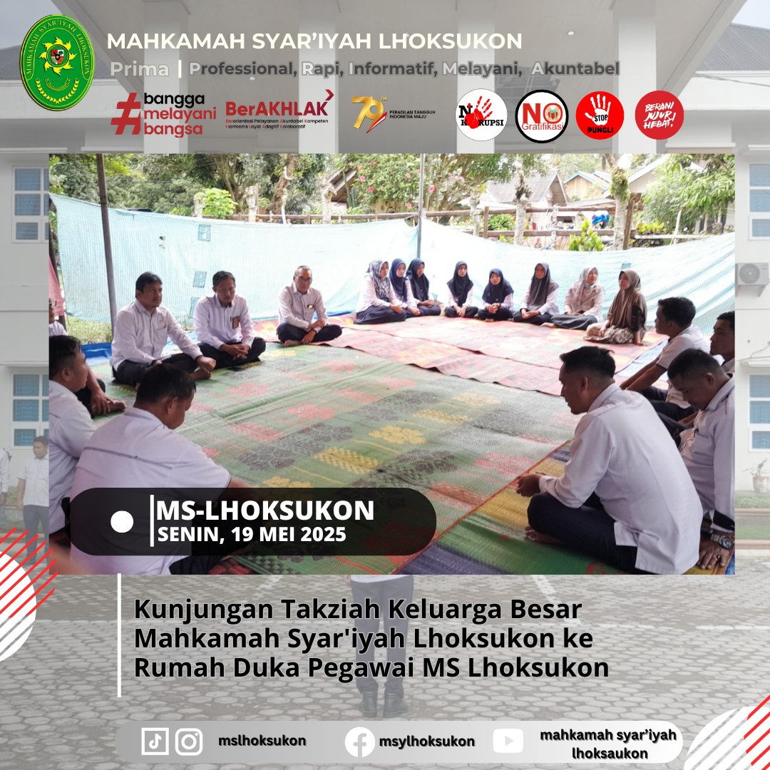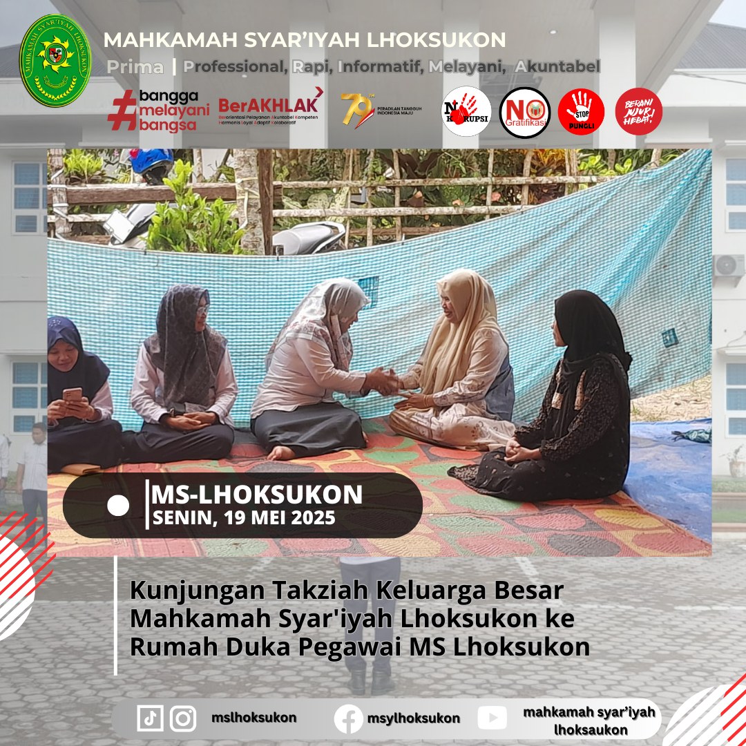 Dalam suasana duka yang mendalam, keluarga besar Mahkamah Syar’iyah Lhoksukon melaksanakan kunjungan takziah ke rumah duka almarhumah Cut Arfah binti T.H. Chik Lamkuta, ibunda dari Yusra, petugas Pelayanan Terpadu Satu Pintu (PTSP) Mahkamah Syar’iyah Lhoksukon, pada Senin, 19 Mei 2025.